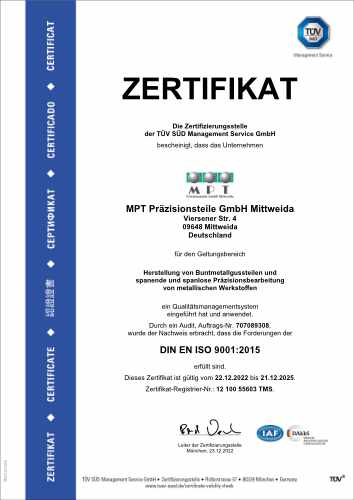 MPT ist für Qualitätsmanagement in der Automobilindustrie nach IATF (International Automotive Task Force) 16949 zertifiziert.